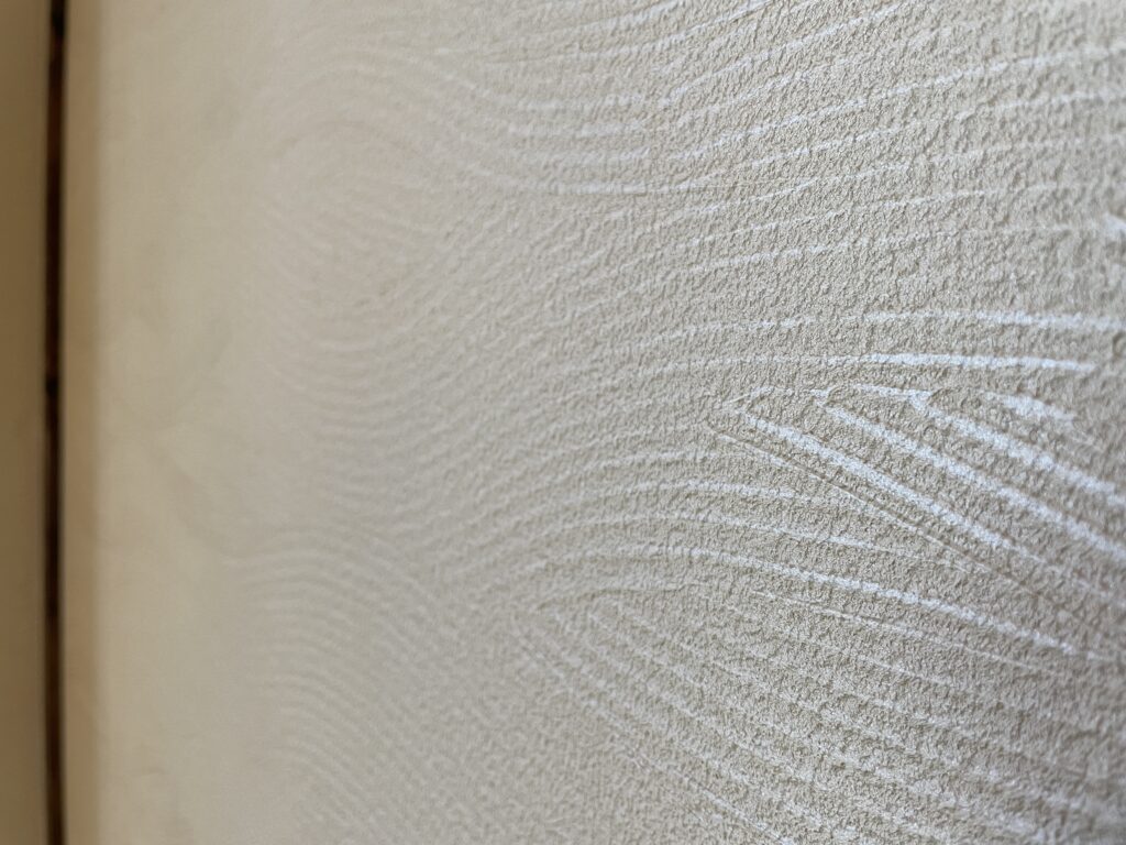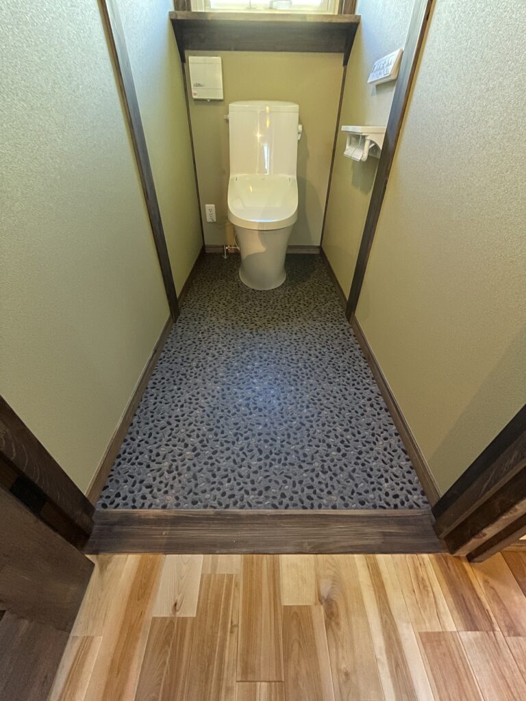 トイレには、玉砂利調のフロアタイルと砂壁風のクロス仕上げに。
