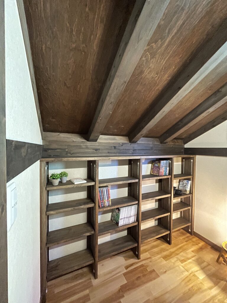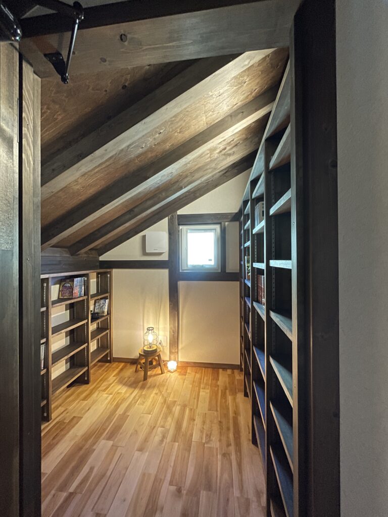 2階の小屋裏スペースに、壁一面に書棚を設けた書斎をつくりました。