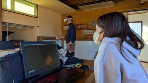 VR装着中の橋本です。目の前は、バーチャル空間が広がっている。