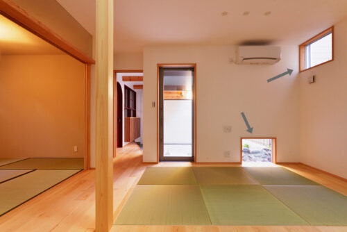 吹き抜けの高い位置の窓や、