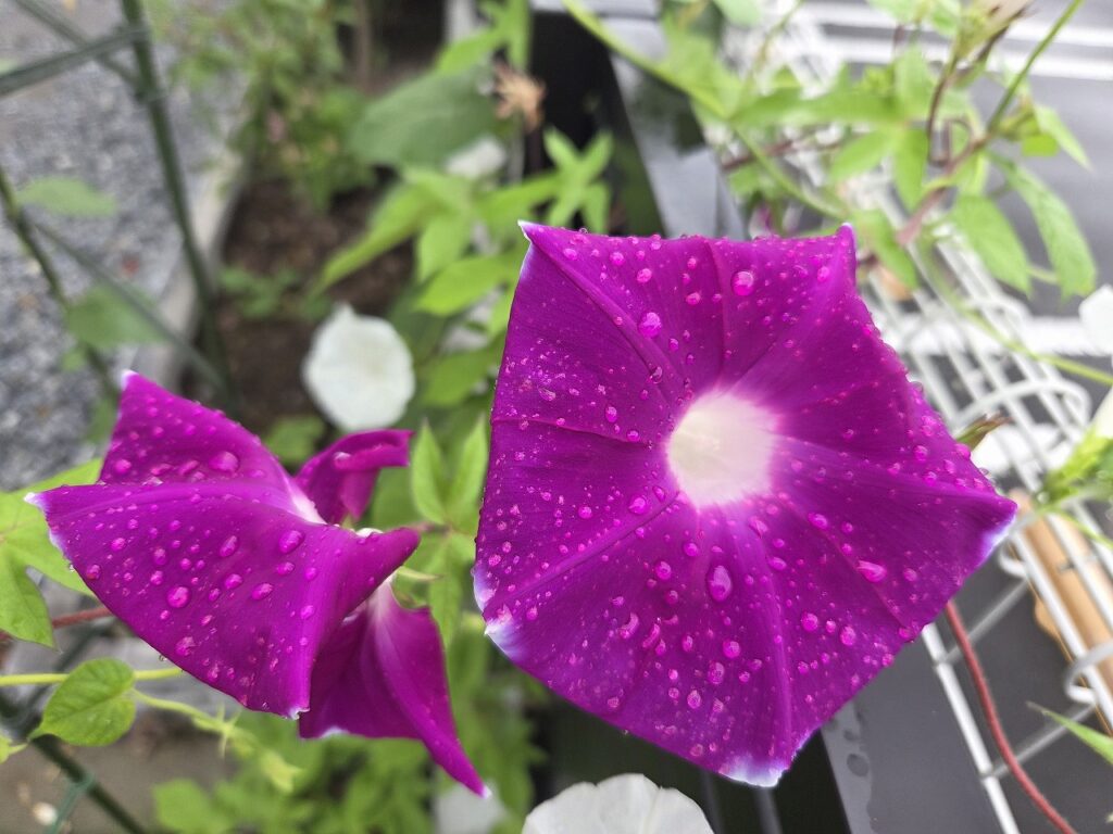 夕方帰ってから水撒きをするのが精一杯ですが、アサガオが涼しそうに咲いています