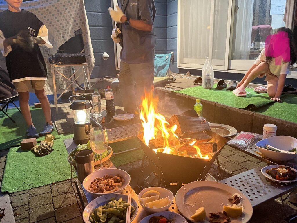 焚火の炎を囲んで話が弾み、程よく焼けたお肉に角ハイボール、