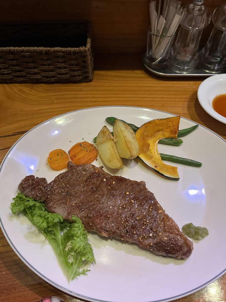お肉はワインでフランベして仕上げられ、香ばしさと程よい塩加減が絶妙!ステーキソースの味も自分好みでワサビを少々、とても美味しく頂きました。