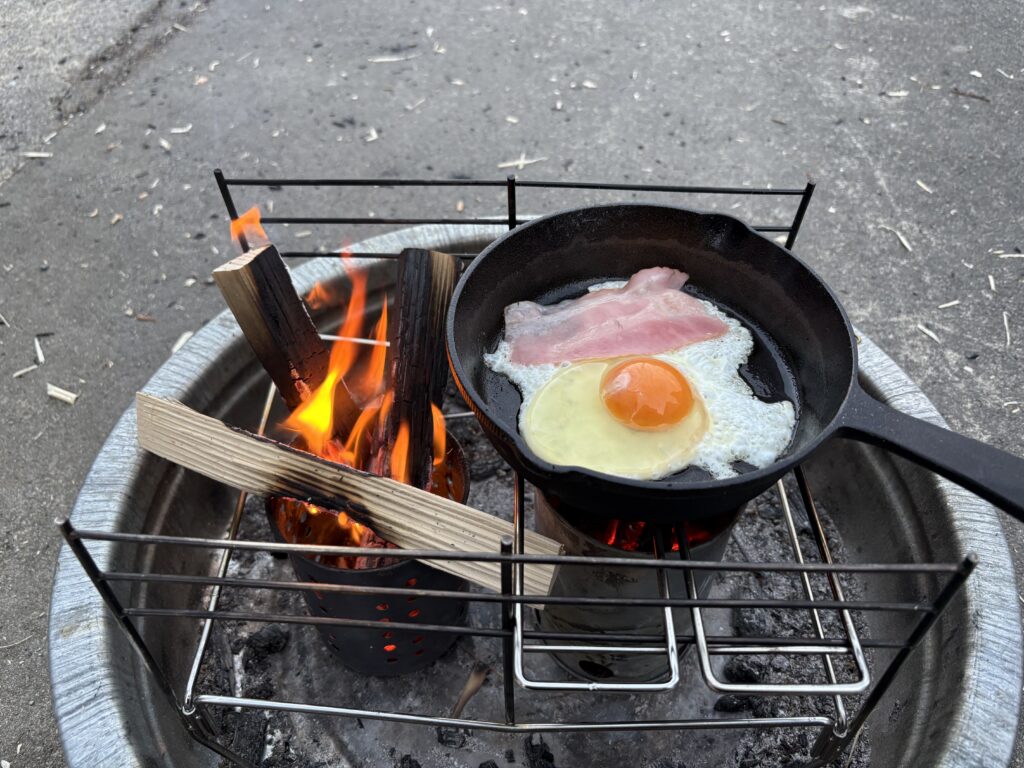 庭でのんびり火を見ながら、子供たちと一緒に目玉焼き焼いたりして楽しんでます。