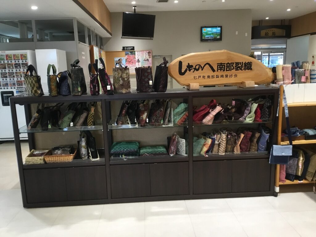 店内には七戸の特産品である長芋を使った漬物や、にんにくオイルなど、地元の魅力が詰まった商品が豊富に揃い、南部裂織や南部小絵馬といった伝統工芸品も人気とのことでした。